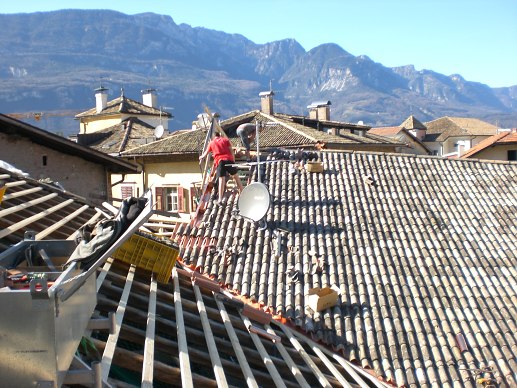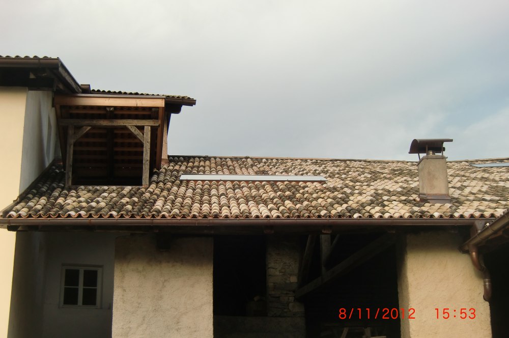 Die Hofstelle in Neumarkt wurde im Jahr 2012 saniert. Dabei wurden die bestehende Dacheindeckung und die Dachlatten abgetragen, der Dachstuhl wurde kontrolliert und notwendige Ausbesserungsarbeiten wurden durchgeführt. Um den ursprünglichen Charakter beizubehalten, haben wir die bestehenden alten Fleimstaler Nonneziegel wiederverwendet. Sämtliche Spenglerabeiten wurden in Kupferblech ausgeführt.