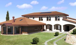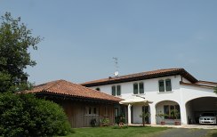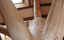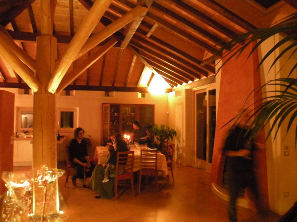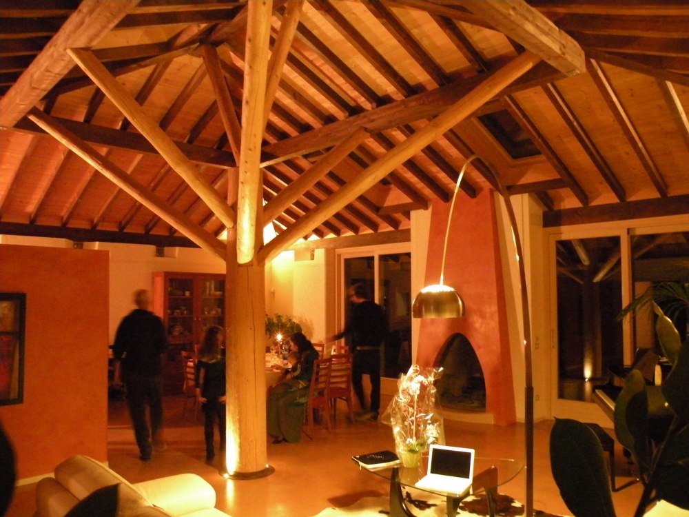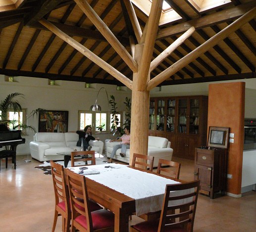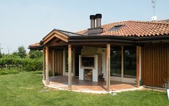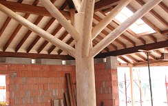 La travatura di questa casa a Santa Maria di Negrar è decisamente fuori dal comune: il tetto è sostenuto da una sorta albero che si trova al centro del soggiorno. Insolito è anche il contrasto tra le terzere scure e le assi profilate chiare. I lavori di lattoneria sono stati eseguiti in lamiera di rame e la copertura del tetto con coppi nuovi.