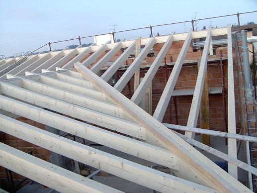 Questa nuova costruzione a Bussolengo è stata dotata di una travatura a vista in abete rosso e isolata con pannelli di fibra di legno: in questo modo il tetto è protetto sia dal gelo invernale che dalla calura estiva.