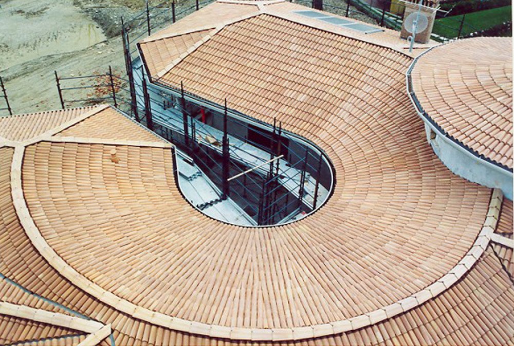 Straordinaria copertura a coppi su un tetto praticamente privo di superfici piane. La particolarità è stata non solo la copertura delle superfici curve, ma anche la copertura dei compluvi.