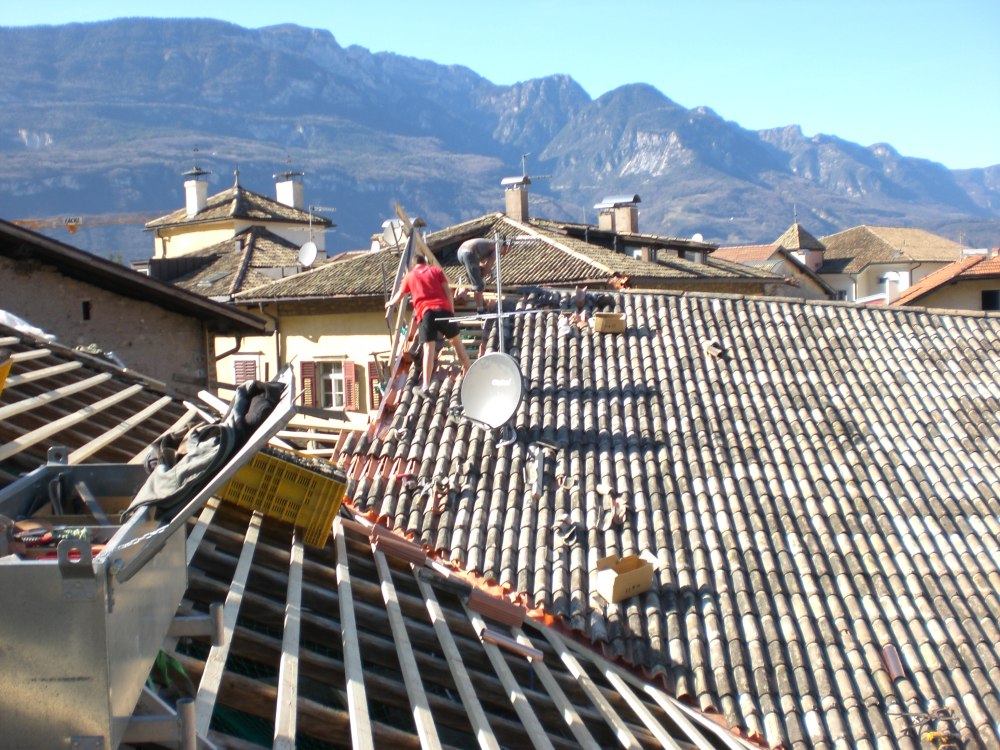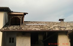 Questa fattoria a Egna è stata risanata nel 2012 con lo smantellamento della copertura preesistente e delle lastre del tetto, il controllo della travatura e l'esecuzione dei necessari lavori di miglioria. Per mantenere il carattere originario abbiamo recuperato i vecchi coppi di coperta della Val Fiemme. Tutti i lavori di lattoneria sono stati eseguiti in lamiera di rame.