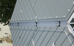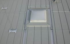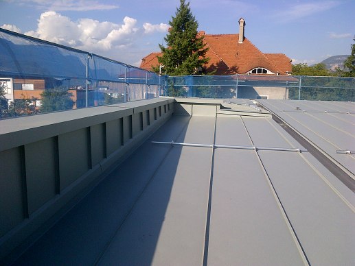 Poiché su una superficie così ampia e complicata il maggior rischio è la dilatazione della lamiera, abbiamo dotato il tetto di un triplo controlistello. Questo ci ha permesso di suddividere il tetto in piccole aree e di dare alla lamiera di alluminio la necessaria libertà di dilatazione.