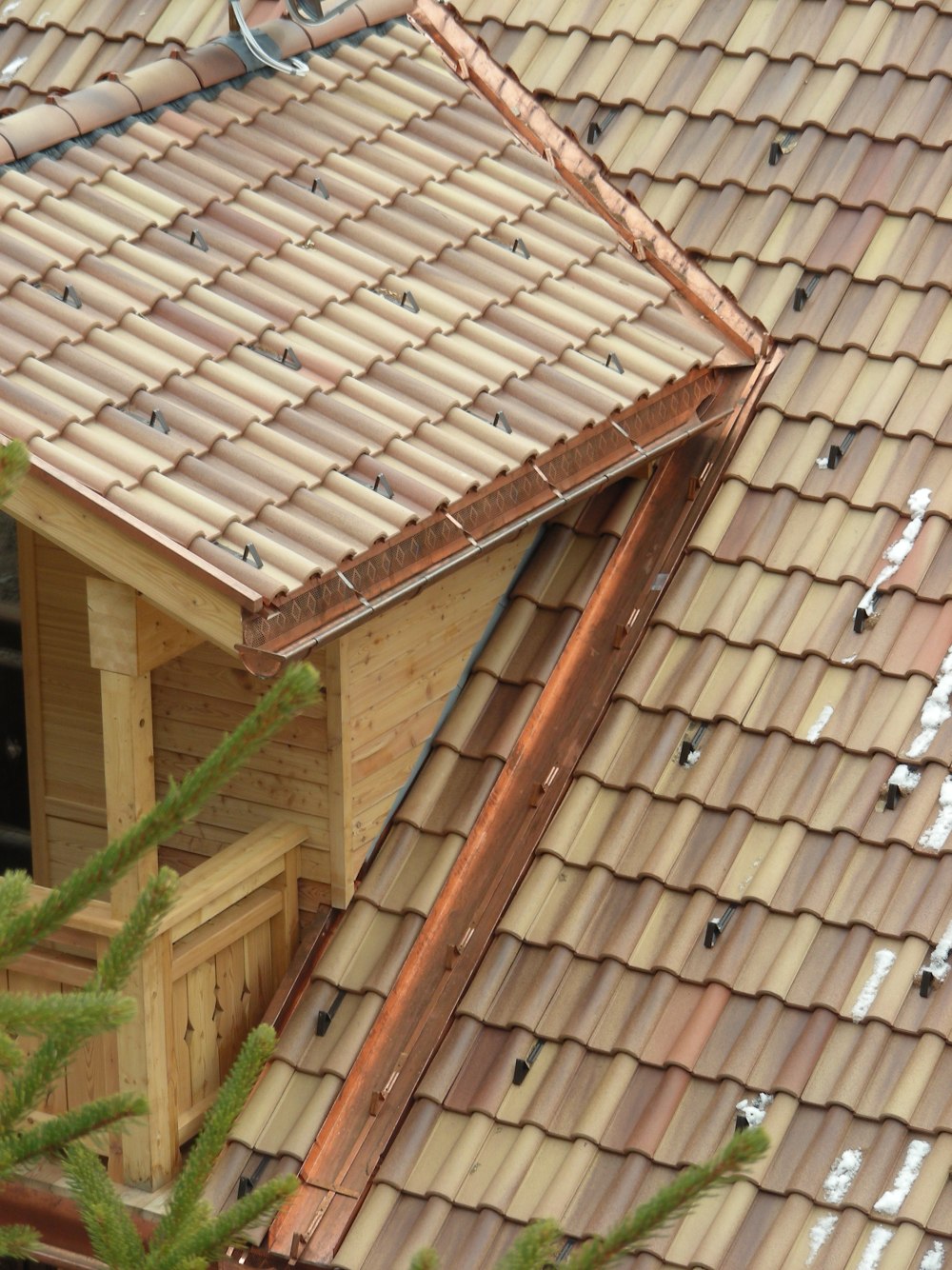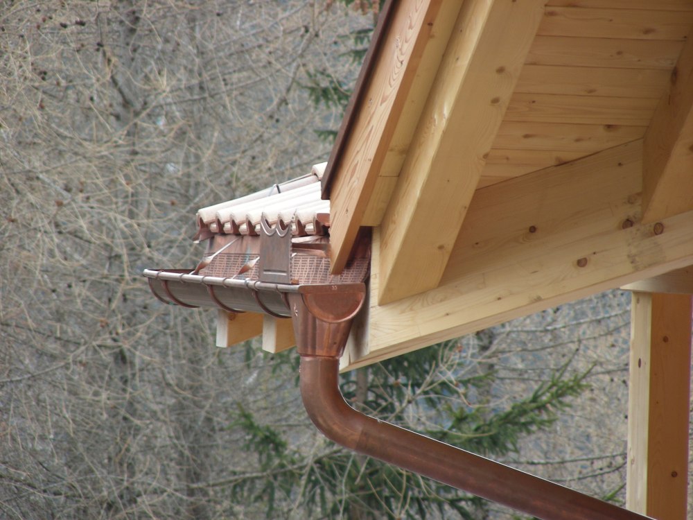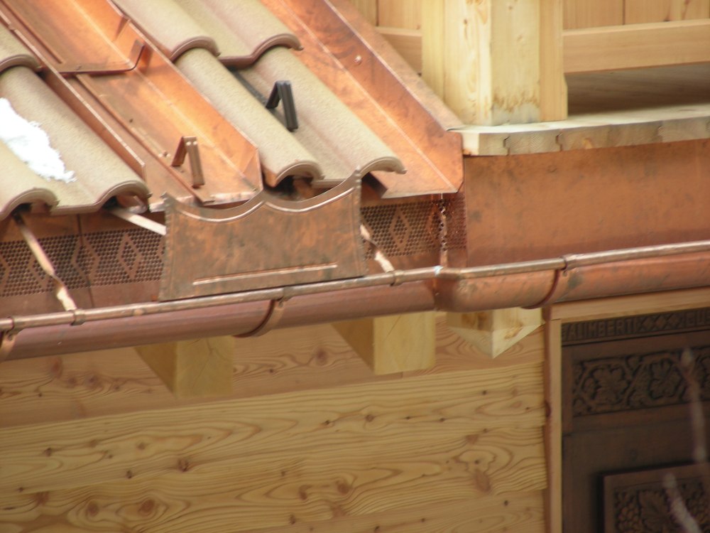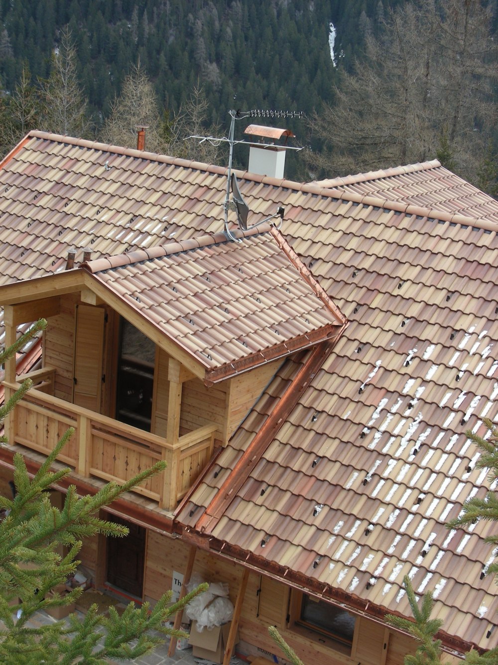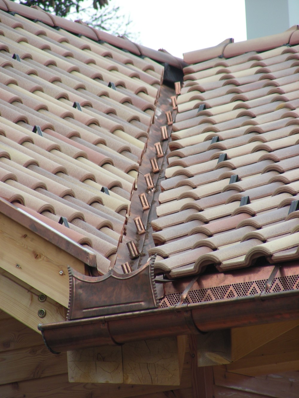 Le immagini mostrano diversi dettagli della formazione della gronda e dei lavori di raccordo su un tetto con copertura a tegole portoghesi.