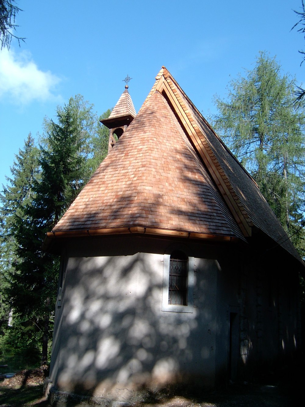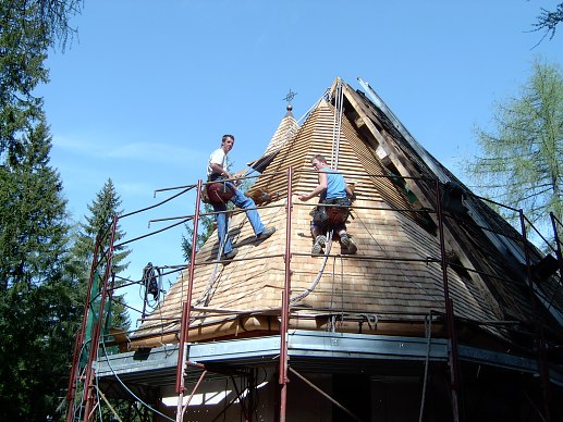 Nella copertura con scandole di larice a spacco della cappella, è stato installato un controlistello a causa delle assi dipinte sottostanti. In un caso del genere è necessario ventilare il colmo. L'utilizzo di grondaie in legno di larice non è di tutti i giorni. Alcune immagini mostrano la speciale lavorazione delle scandole sul displuvio e sul bordo frontale della falda.