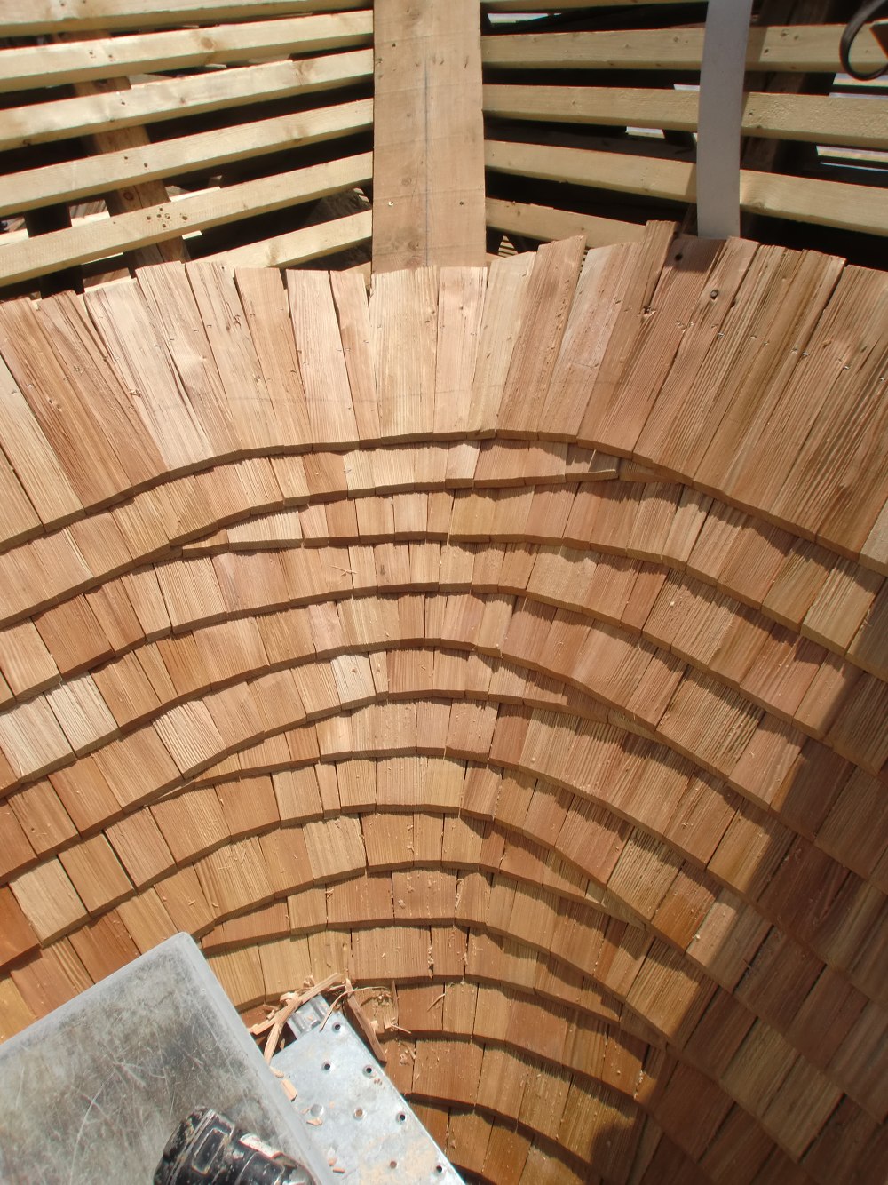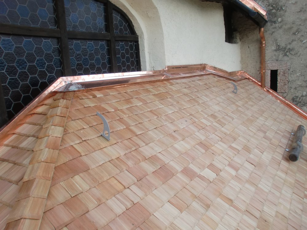 Dopo aver smantellato le vecchie tegole in cemento, abbiamo provveduto a risanare la travatura, installare il listello, eseguire tutti i lavori di lattoneria con lamiera di rame e posare le nuove scandole di larice a spacco. Per i mastri conciatetto la copertura del compluvio ha rappresentato una particolare sfida.