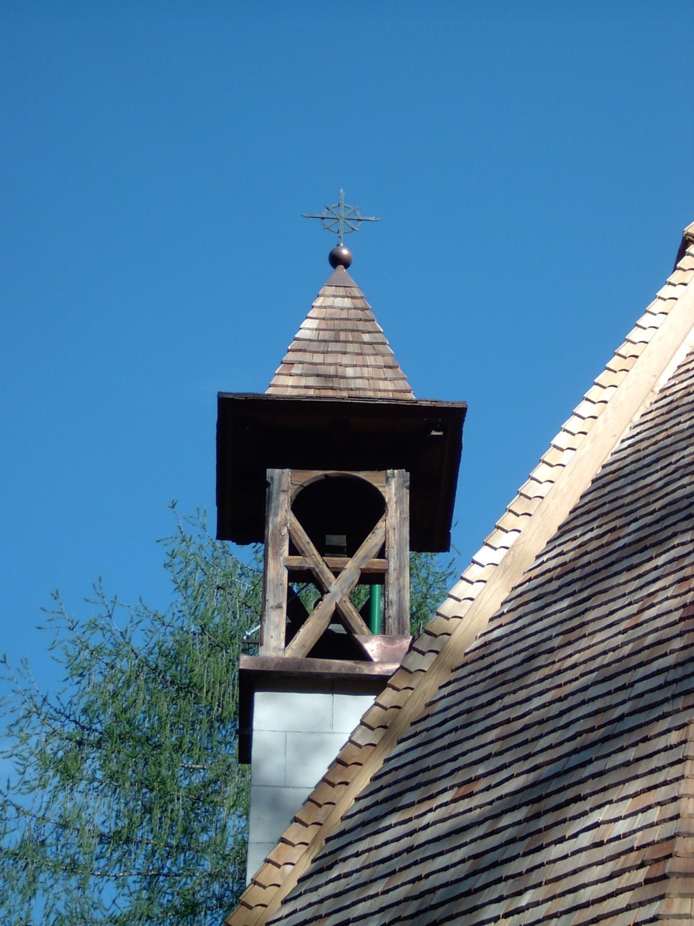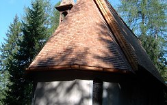 Bei der Eindeckung der Kapelle am Mendelpass mit gespaltenen Lärchenschindeln wurde wegen der darunter liegenden bemalten Bretter eine Konterlattung mit Folie angebracht. In so einem Fall ist es erforderlich, den First zu entlüften. Nicht alltäglich ist die Verwendung der Dachrinnen aus Lärchenholz. Einige Fotos zeigen die spezielle Verarbeitung der Schindeln an den Graten und am Ortgang.