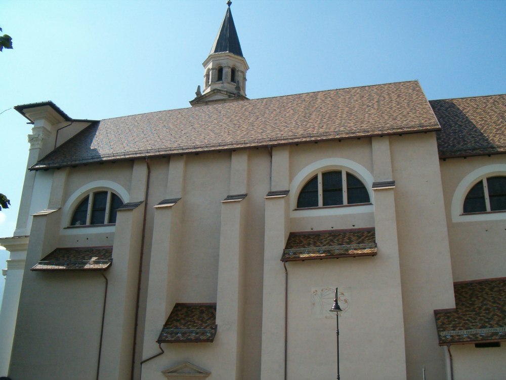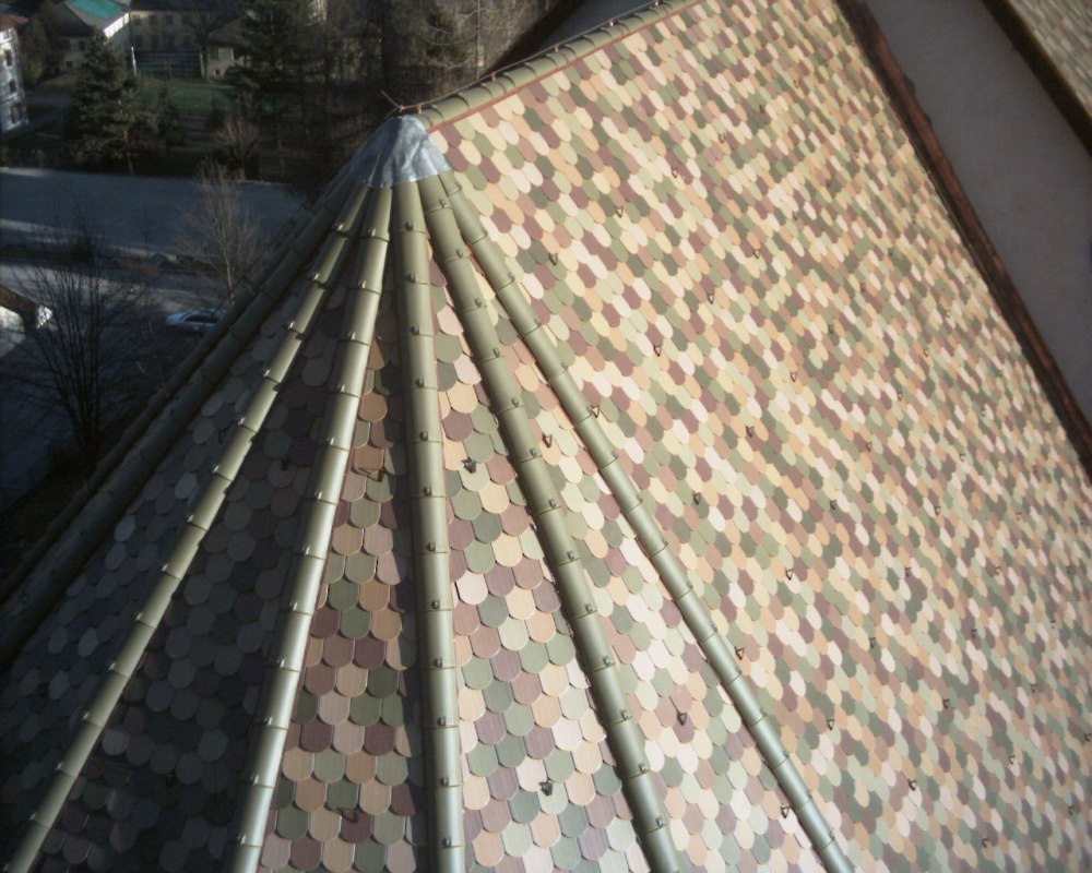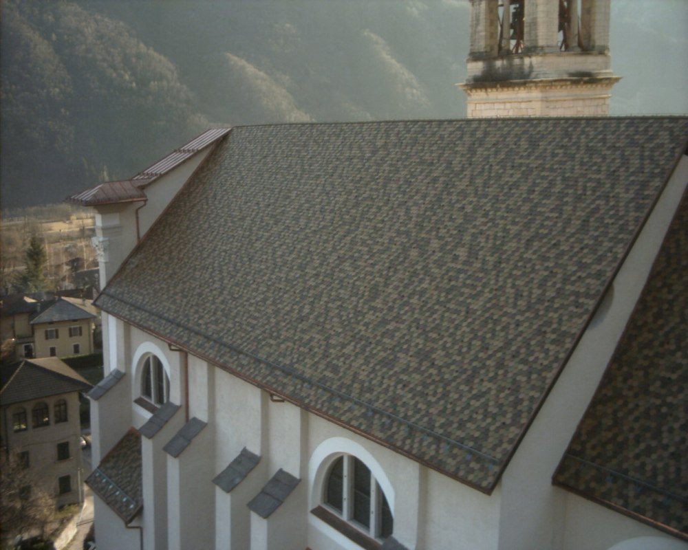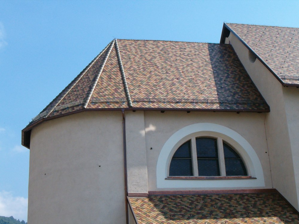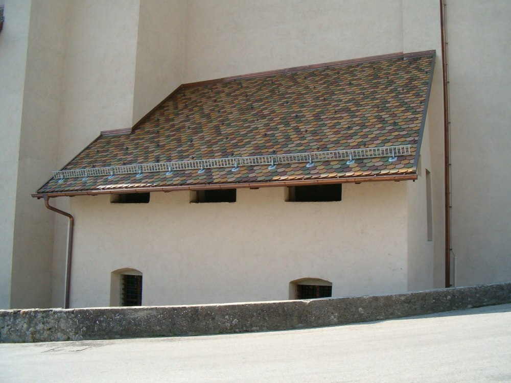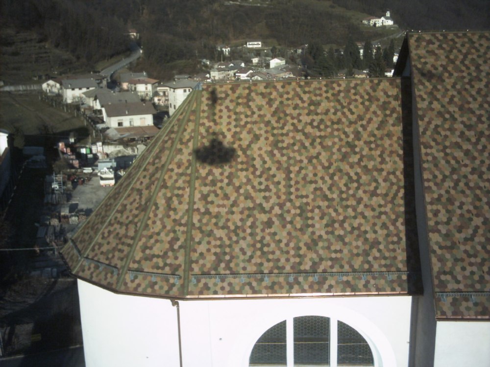 Die Pfarrkirche in Roncegno musste saniert werden, da die alten Biberschwanzziegel teilweise schon herunterfielen. Sie mussten durch neue ersetzt werden. Gleichzeitig waren die Dachstruktur und die Rauschalung auszubessern. Dabei sollten auch sämtliche Spenglerarbeiten mit Kupferblech neu ausgeführt werden. Die Farbe des Daches sollte den Herbstfarben ähnlich sein. Wir verwendeten also Biberschwanzziegel in 8 verschiedenen Farben, wobei alle mit Sturmbügeln befestigt werden mussten.