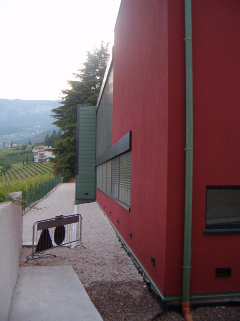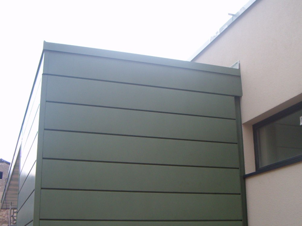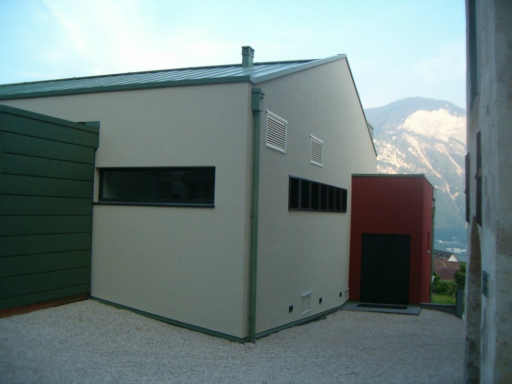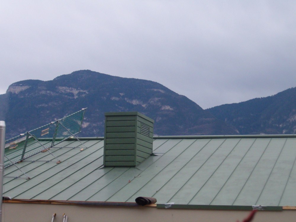 Die Dacheindeckung des Kulturhauses in Kurtatsch ist mit Kupferblech der Farbe nordic grün ausgeführt worden. Ebenfalls wurden ein Teil der Mauern und der Kamin mit demselben Material verkleidet.