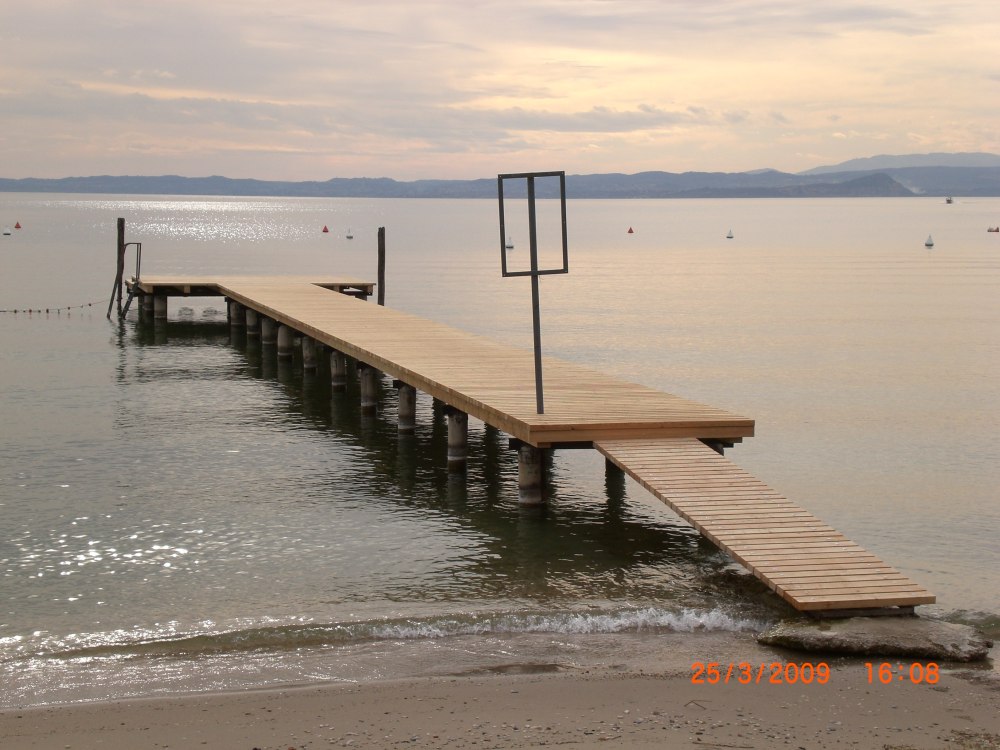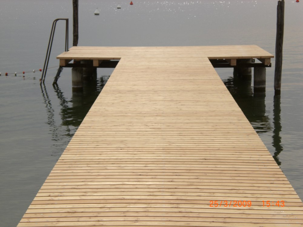 Diese Badestege am Gardasee wurden auf den bestehenden Betonsäulen mit Lärchensparren und Lärchenlatten errichtet.