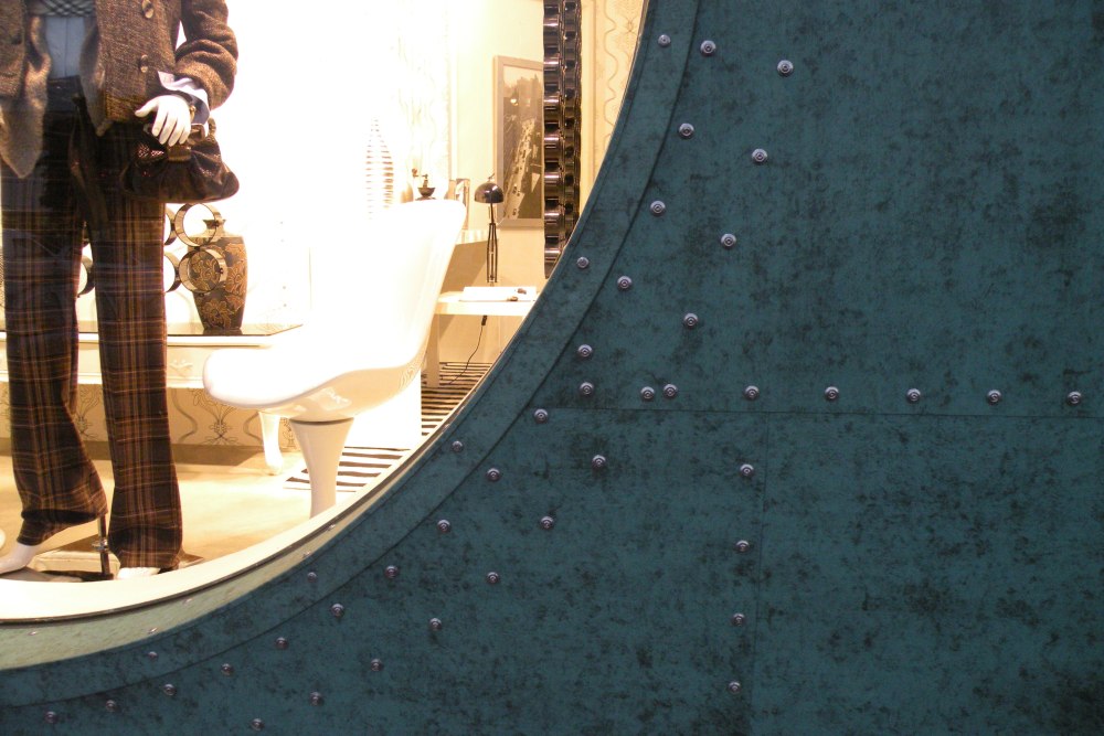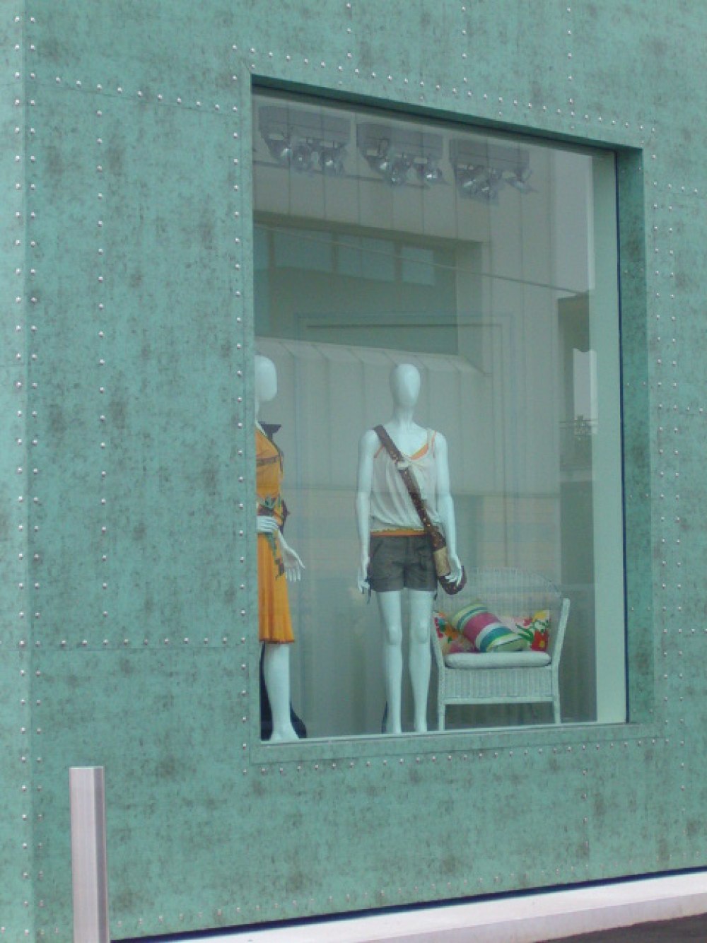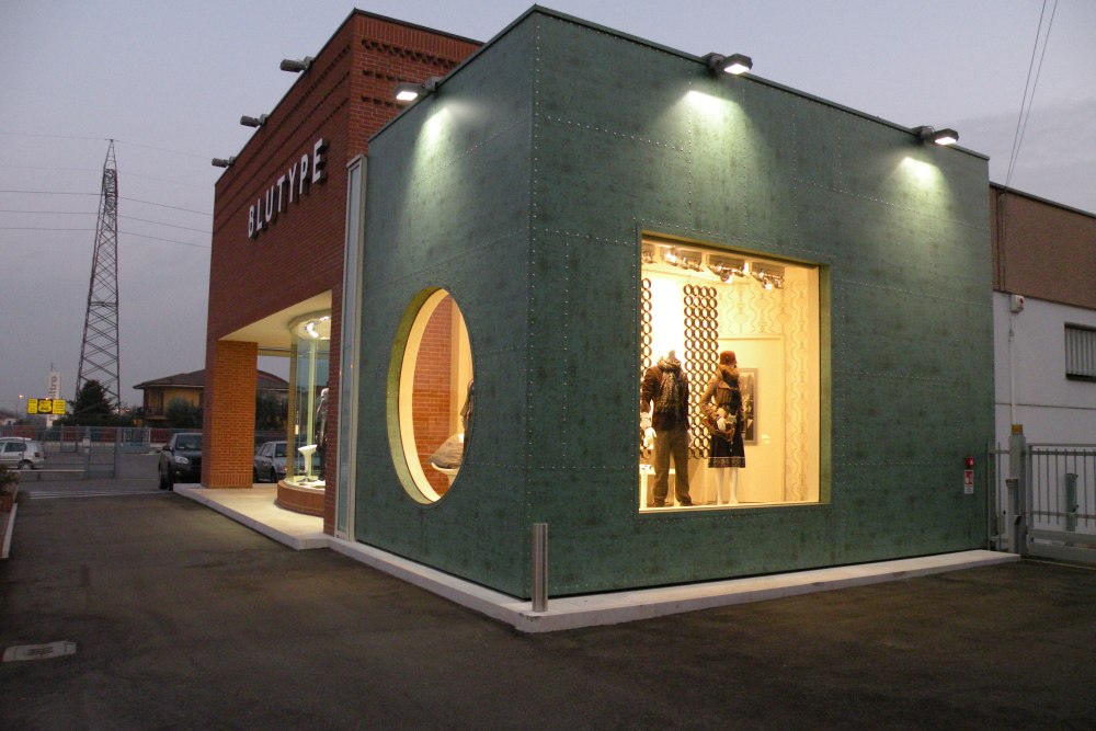 Verkleidung der Fassade dieses Modegeschäftes in Bussolengo mit Aluminiumblech, Farbe Tecu Patina.