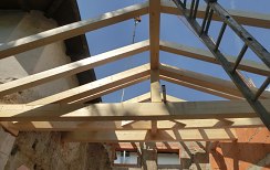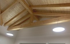 Bei der Sanierung des Pförtnerhauses in Margreid wurde das alte Dach abgetragen und durch ein Neues ersetzt. Der Dachstuhl aus Fichtenholz musste dabei den bestehenden Mauern angepasst werden. Die Holzfaserdämmung bietet optimalen Schutz gegen die Hitze im Sommer und die Kälte im Winter. Die verlegten Mönch- & Nonneziegel sind charakteristisch für die Unterlandler Gemeinde.