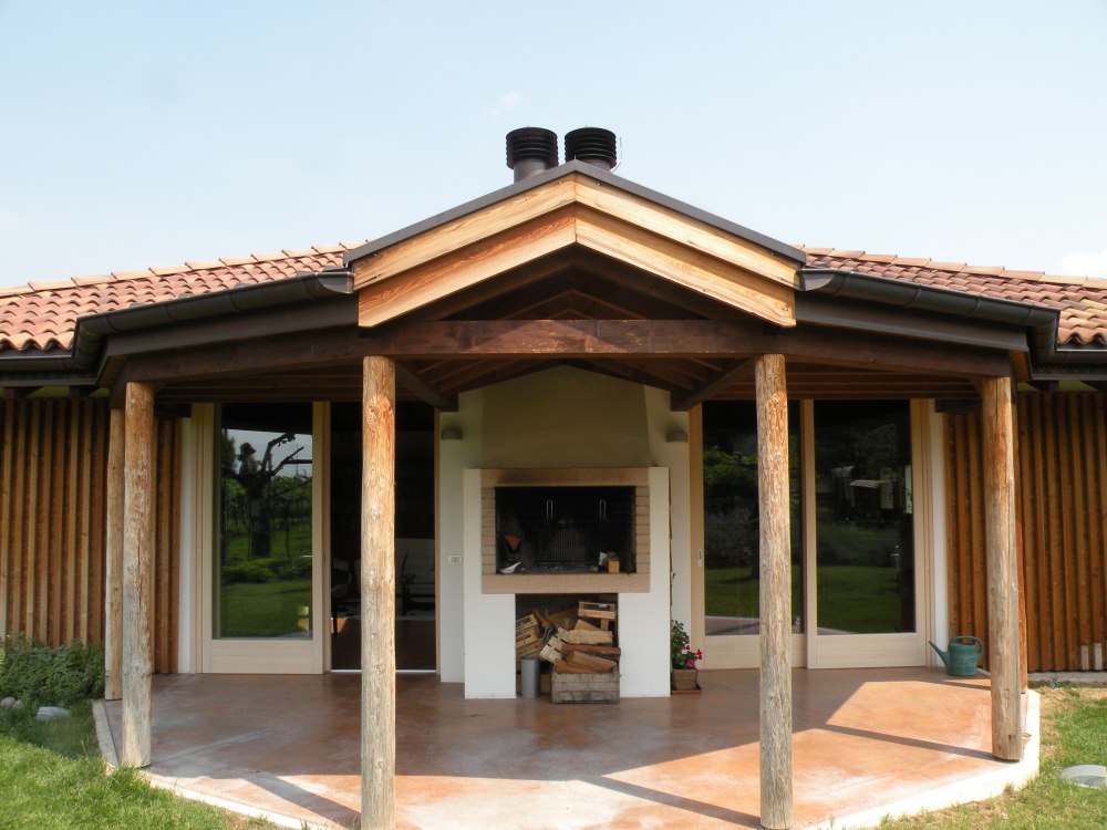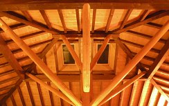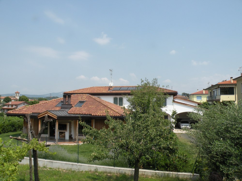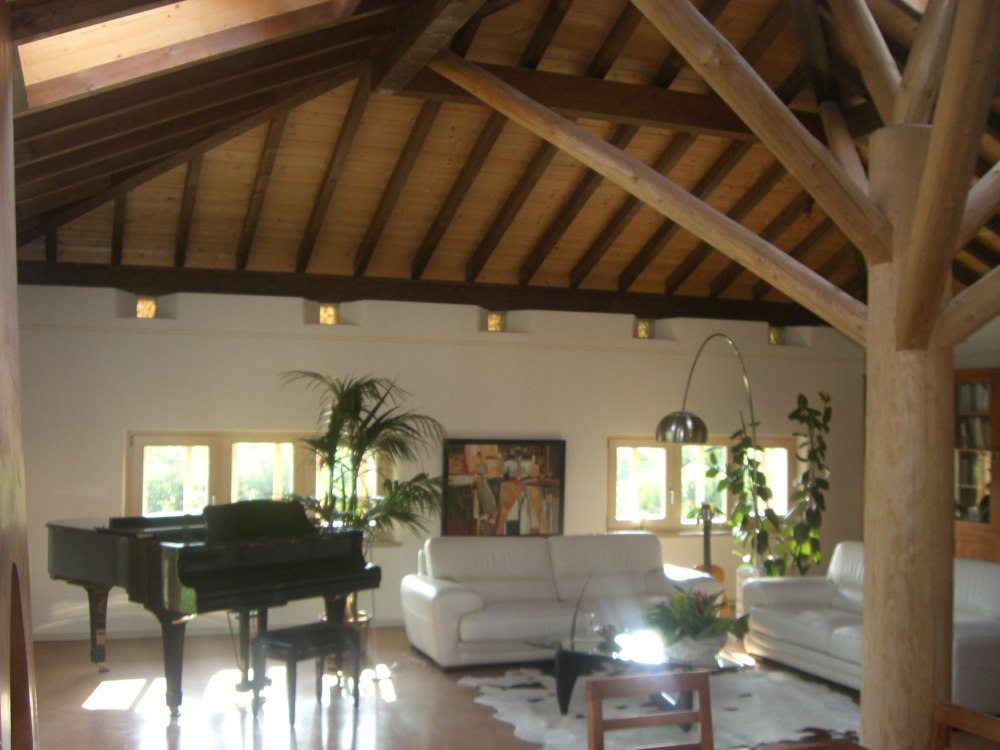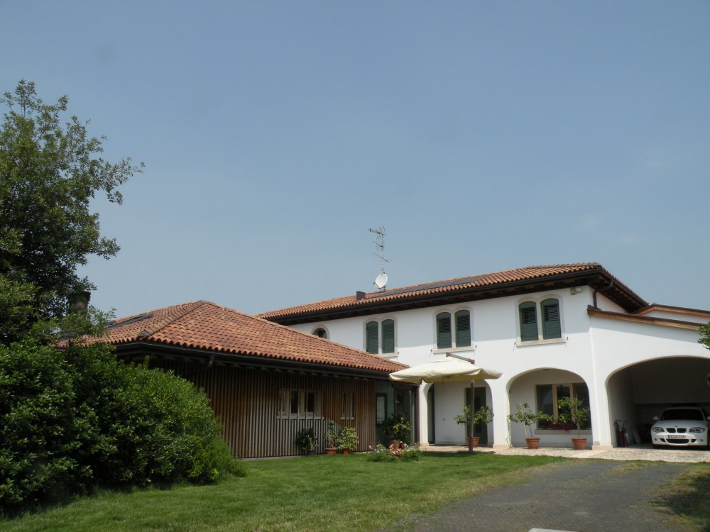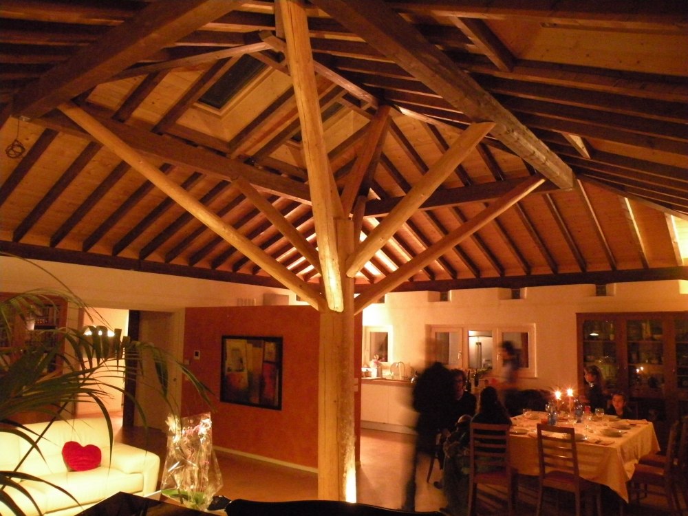 Nicht alltäglich ist der Dachstuhl in Santa Maria di Negrar, da das Dach von einem sogenannten Baum getragen wird, welcher sich in der Mitte des Wohnzimmers befindet. Ungewöhnlich ist auch der Kontrast zwischen den dunklen Dachsparren und den hellen Profilbrettern. Die Spenglerarbeit wurde in Kupferblech ausgeführt und das Dach mit neuen Mönch und Nonneziegeln eingedeckt.