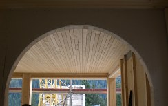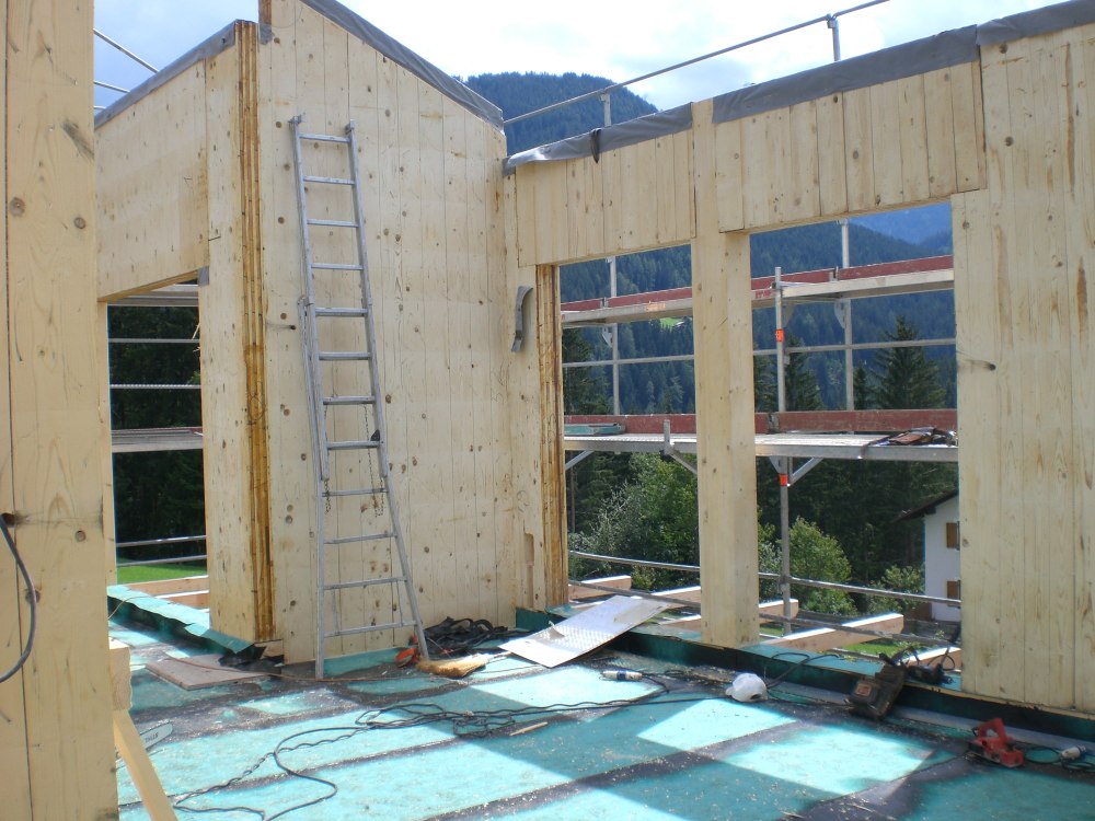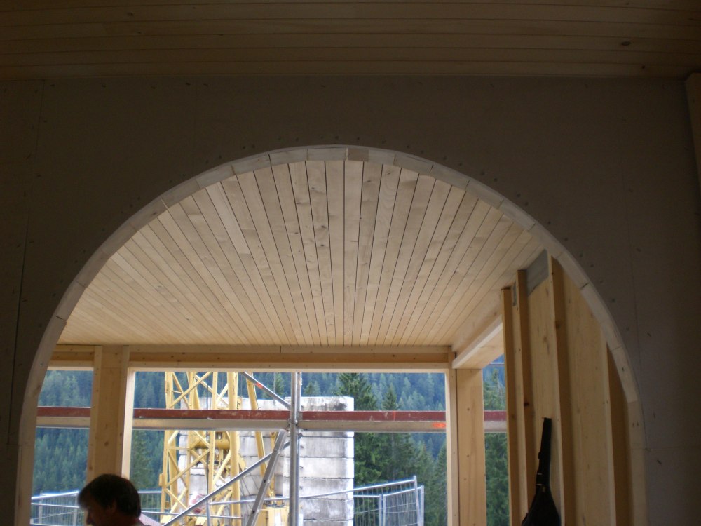 Zwischen den einzelnen Stockwerken haben wir eine Sichtdecke in Fichtenholz eingezogen, welche besonders schallabsorbierend ist.