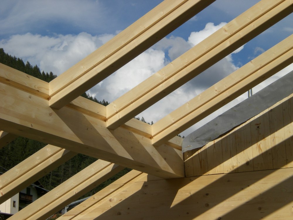 Das Dach wurde als Sichtdachstuhl ausgeführt, mit Holzfaserplatten gedämmt und mit flachen Betondachsteinen eingedeckt.