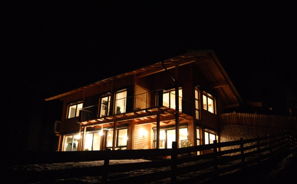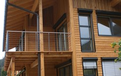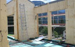 Dieses Holzhaus besteht aus mehreren Stockwerken und wurde mit kreuzvernagelten Mehrschichtplatten errichtet.